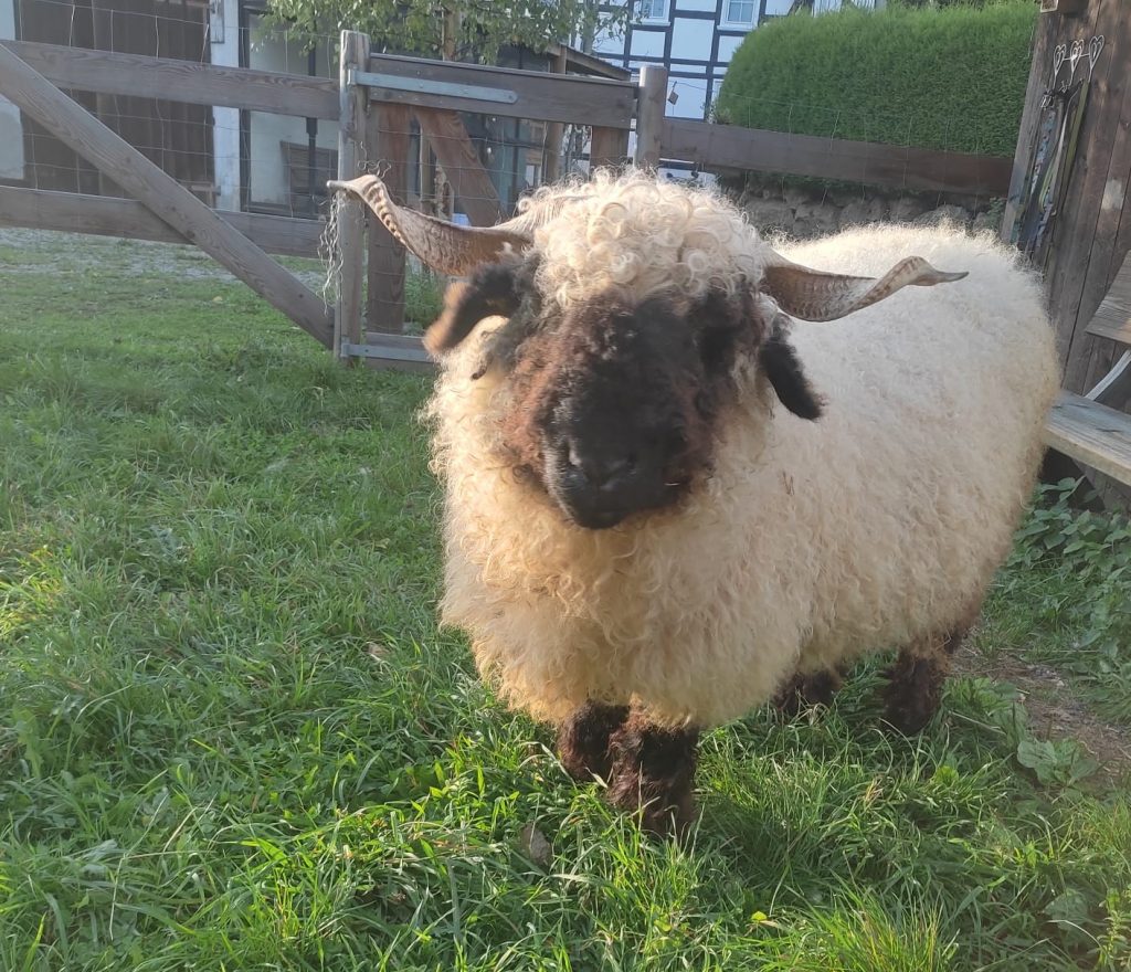 Der „kleine“ Wollebert ist im Oktober 2024 zu uns gekommen. Mutig hat er die Wiese betreten und seine neue Herde begrüßt. Er liebt es zu fressen und mümmelt sich genüsslich durch den Tag. Anfangs war er etwas schüchtern, doch schnell hat er entdeckt, wie sehr er es genießt, gekuschelt zu werden. Seine kleinen Woll-Locken haben absolutes Lieblingspotenzial.